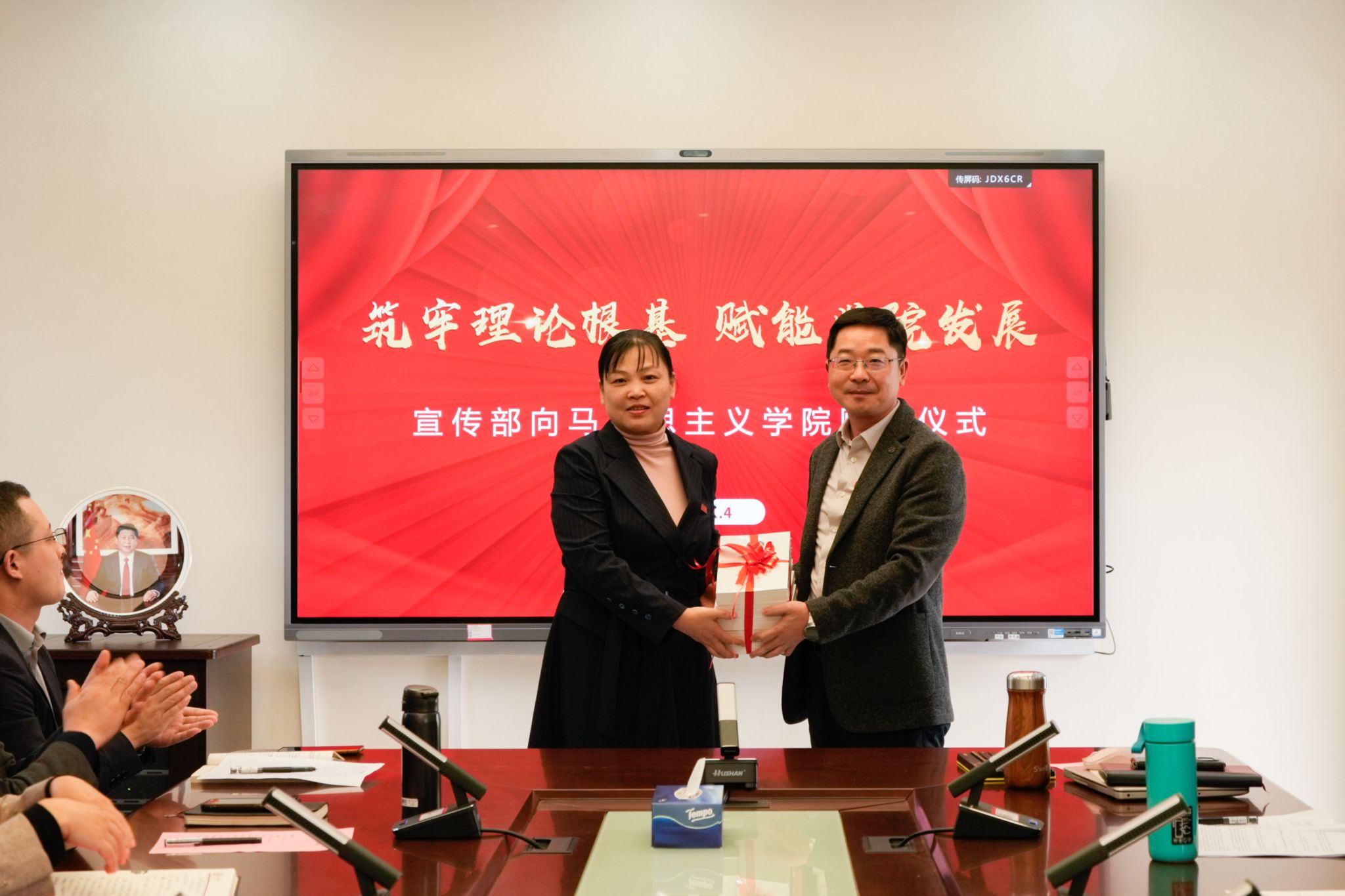 2025年11月4日下午,“筑牢理论根基 赋能学院发展”赠书仪式在马克思主义学院3009会议室顺利举行。学校党委宣传部常务副部长徐远超与马克思主义学院全体教师共同参加了本次活动。仪式由党支部书记刘静主持。她在开场发言中表示,学校宣传部此次向马克思主义学院全体教师赠送的《习近平谈治国理政》全五卷,是系统阐述习近平新时代中国特色社会主义思想的重要著作,为学习贯彻党的创新理论提供了权威教材。这份精心准备的礼物不仅体现了学校对马克思主义学院建设发展的深切关怀,...