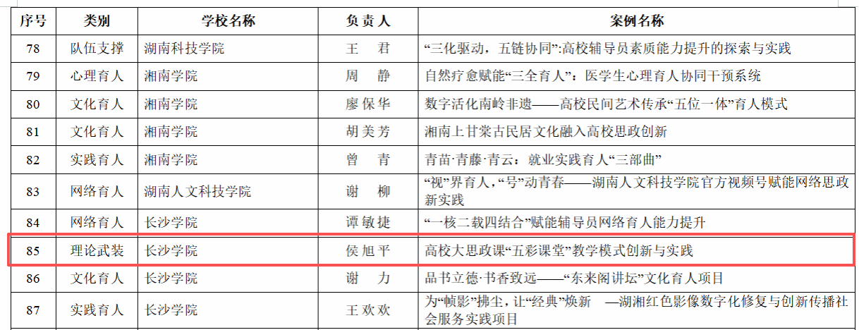 近日,中共湖南省委教育工委、湖南省教育厅、湖南中南传媒公益基金会公布了2025年度第一批高校思想政治工作优秀案例评选结果,由长沙学院马克思主义学院院长侯旭平教授主持申报的“高校大思政课‘五彩课堂’教学模式的创新与实践”案例成功入选。本次优秀案例征集与宣传活动旨在推进时代新人铸魂工程,总结推广全省高校在思想政治工作领域的先进经验。“五彩课堂”教学模式由侯旭平教授带领团队,在我院持续深化思政课程与课程思政协同育人的探索中形成。...