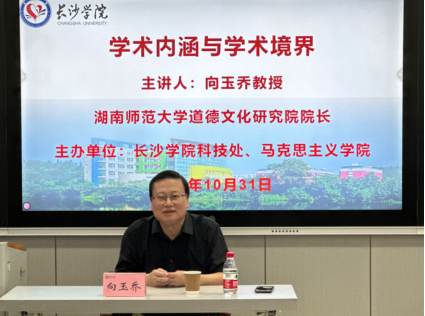 向玉乔系湖南师范大学道德文化研究院院长、《伦理学研究》副主编,二级教授、博士生导师,中央“马工程”专家,全国应用伦理专业学位研究生教育指导委员会委员。讲座中,向教授以“学术内涵与学术境界”为题,从教书匠到教育家的区别切入主题,阐述了教师在长期的教学科研过程中应该对学生、学术乃至人类社会应有的作用与贡献。向教授还分享了自己科研论文写作与发表的经验。