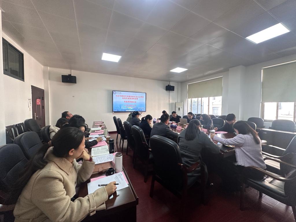 侯旭平教授做了“思政课五彩课堂的创新与实践”国家一流本科课程建设情况汇报。徐晓阳博士做了“中国近现代史纲要”线上线下混合式一流本科课程建设情况汇报。全国高校思想政治理论课教学展示竞赛获奖教师、各教研室主任围绕“湖南如何落实习近平文化思想”“湖南如何贯彻落实党的二十届三中全会精神”“习近平新时代中国特色社会主义思想三进工作”等内容展开交流。