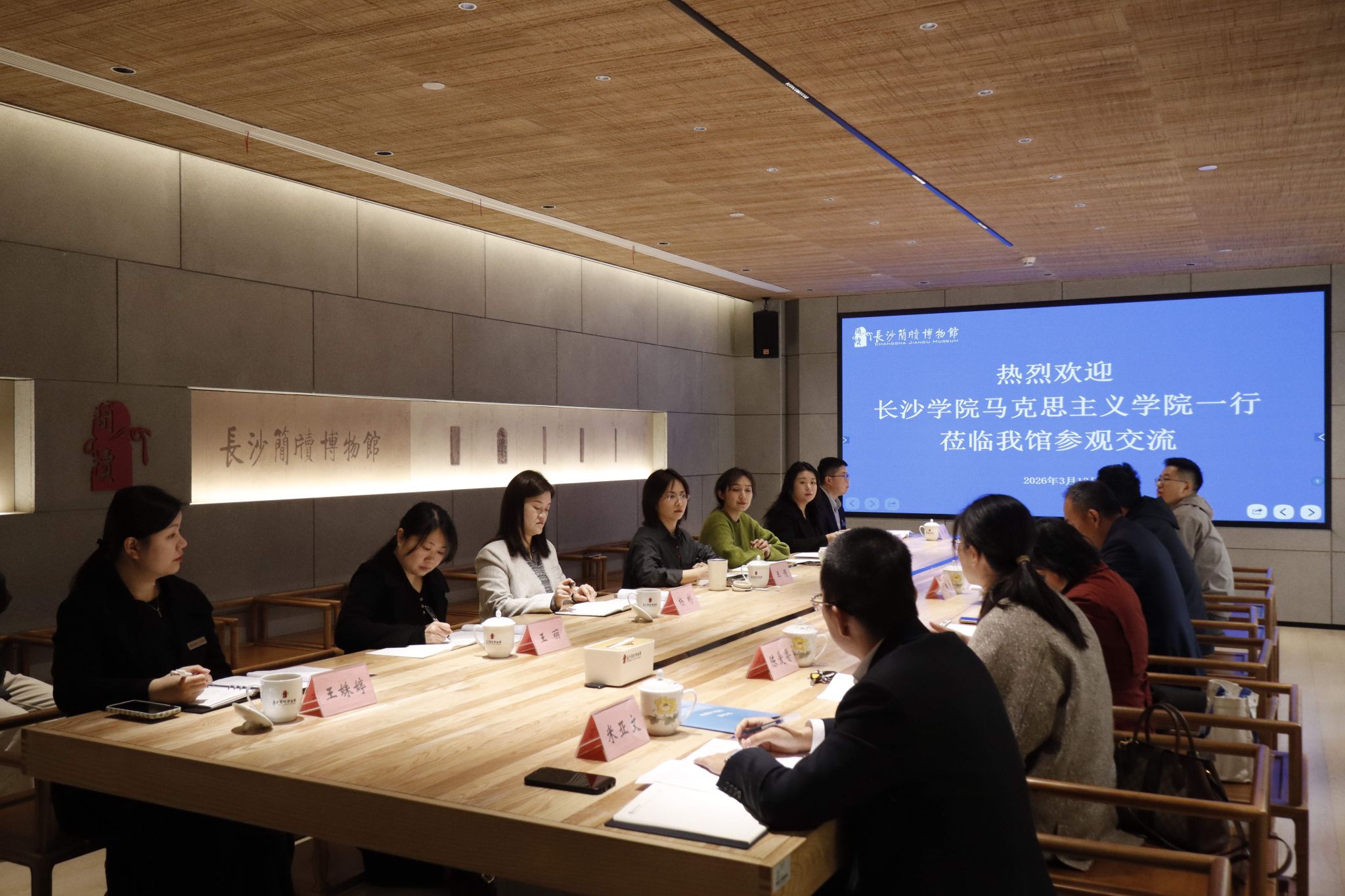 交流会上,双方分别介绍了单位基本情况与发展成果。长沙简牍博物馆作为国家一级博物馆,馆藏以走马楼三国孙吴纪年简牍等珍贵简牍为特色,是承载中华政治智慧与文化基因的重要阵地。马克思主义学院依托坚实学科基础与高水平师资队伍,持续推动思政育人与中华优秀传统文化深度融合。