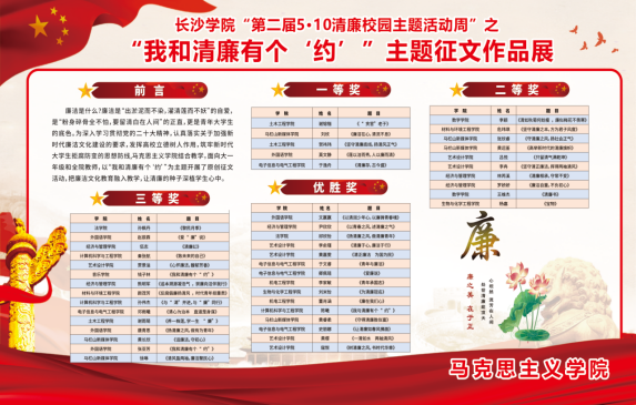 本次征文活动是长沙学院第二届“5·10清廉校园主题活动周”的特色活动之一。本次活动得到大一学生和全院教师积极响应,师生们积极参与、踊跃投稿,共收到300篇征文作品。作品主题鲜明紧扣“廉洁”,体裁丰富,有书信、小说、诗歌、散文、议论文等,内容翔实,情感真挚。针对上述作品,马克思主义学院采取初筛、复审等形式,对参赛作品进行了认真的评选,共选出45篇优秀作品,其中一等奖5篇,二等奖10篇,三等奖15篇,优胜奖15篇。