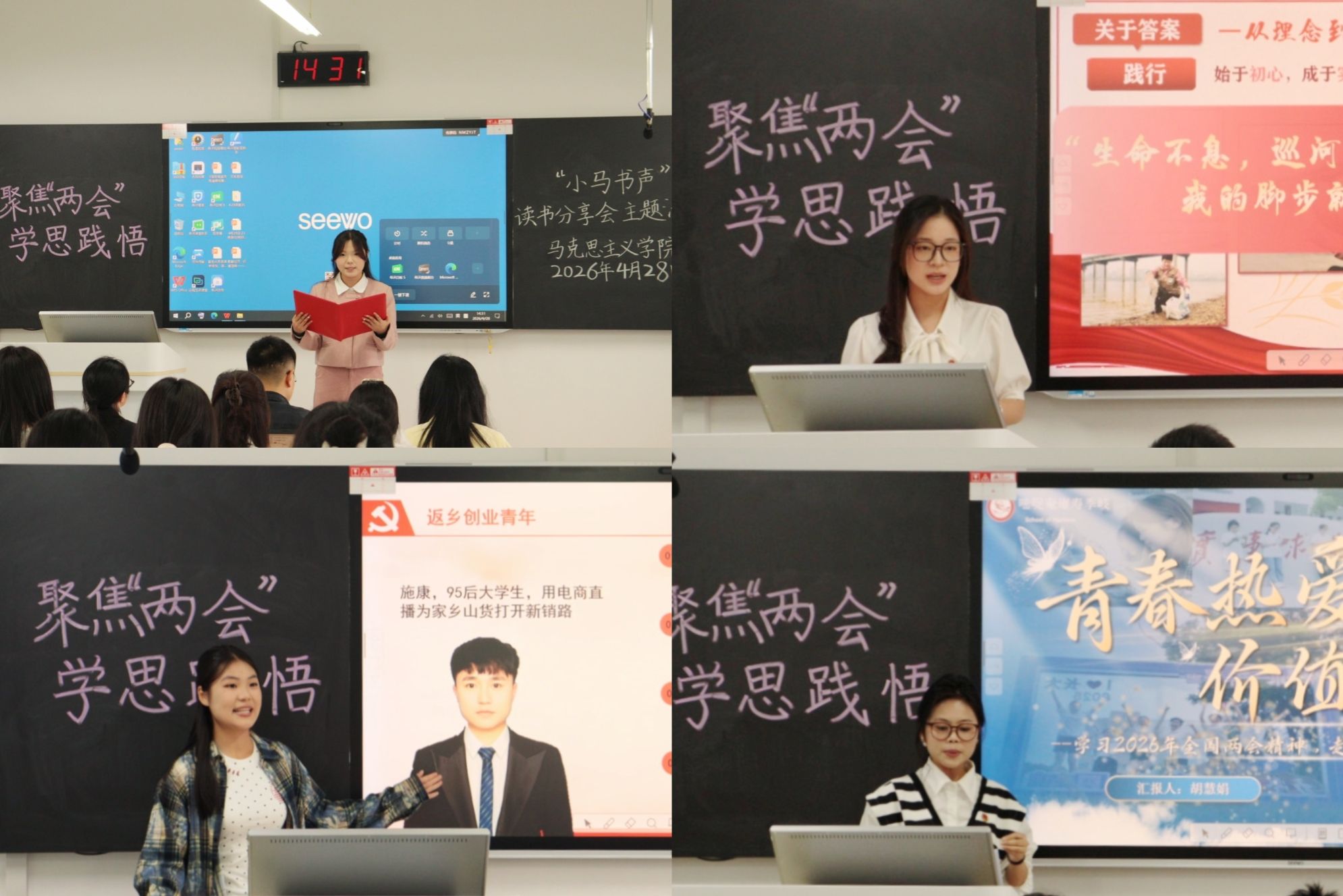 4月28日,长沙学院马克思主义学院以“聚焦两会,学思践悟”为主题的“小马书声”读书分享会决赛在第一综合楼4009举行。经过前期班级初赛和年级遴选,7组选手同台竞技,分享学习感悟,讲述两会故事。