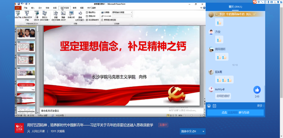 为了进一步落实教学常规,充分发挥集体教研的作用,共同强化和规范备课,提高教学质量和水平,由湖南科技大学、长沙学院、湖南汽车工程职业技术学院三所高校的马克思主义学院联合开展的集体备课活动,于2022年5月4日在人民网通过线上直播的形式进行公开课展示活动。本次活动的主题为“习近平总书记关于青年的重要论述融入思政课教学”,我院向伟老师做了“坚定理想信念 补足精神之钙”的教学展示。