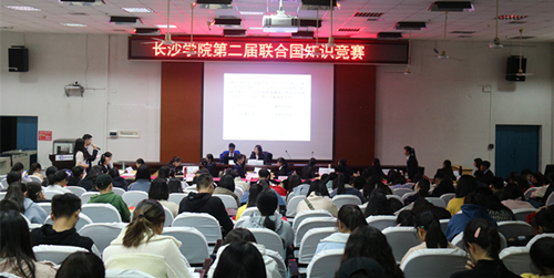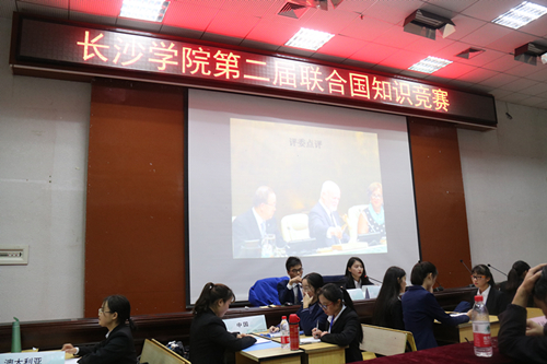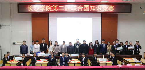 为增强同学们对联合国的了解,培养同学们国际视野,11月30日晚,由马克思主义学院、校团委主办,模拟联合国协会承办的长沙学院第二届模拟联合国知识竞赛,在致远楼学术报告厅如期举行。马克思主义学院周执前院长、候旭平副教授、胡腾蛟副教授、模拟联合国协会前任会长刘乃源、现任会长崔咏琪担任评委。18位选手进入决赛,300余位同学到场参与。
