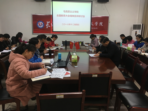 2018年12月4日下午,马克思主义学院在涵虚楼A1304会议室举行全国教育大会精神宣讲研讨会。党总支书记贺革主持研讨活动,全体教师参加会议,党委书记韦成龙应邀出席研讨会。